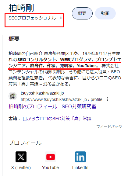 氏名の下には「SEOプロフェッショナル」といった職業が記載されています。これは、私が個人的に設定したわけではなく、当サイトにもそのような職業に関する明確な記載はありません。おそらく一般ユーザーの申請登録か、Googleが独自のアルゴリズムで判断した結果だと推測されます。