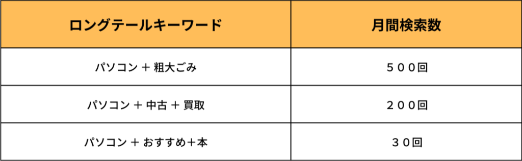 例えば「パソコン」という検索キーワードから派生するロングテールキーワードは以下のようなものがあります。