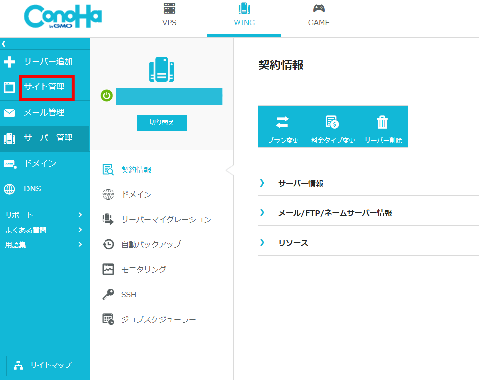 コントロールパネルにログインしたら左側の【サイト管理】を押します。