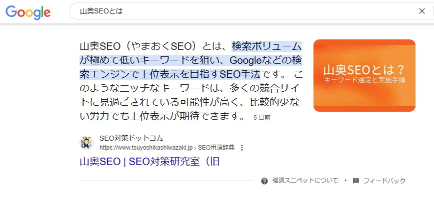 強調スニペットは、検索結果一覧の中にページが埋もれてしまうことがないため、通常の検索結果と比較しても優位な表示結果です。