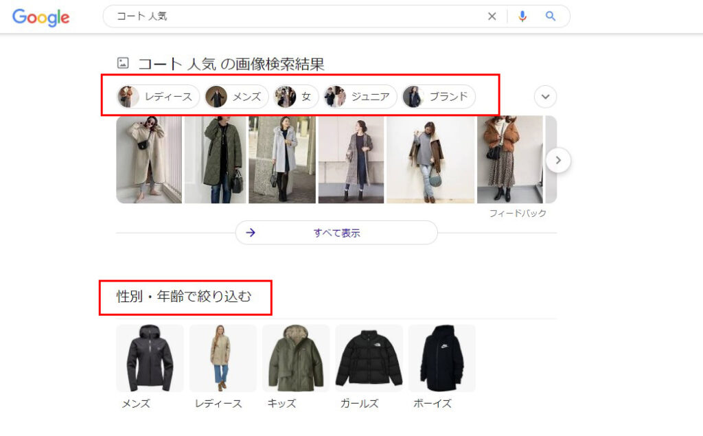 人気のコートが、画像の一覧で表示されていますが、注目したいのは、その上にある絞り込みのキーワードで、「レディース」「メンズ」「女」「ジュニア」「ブランド」…と並んでいる事がわかるかと思います。