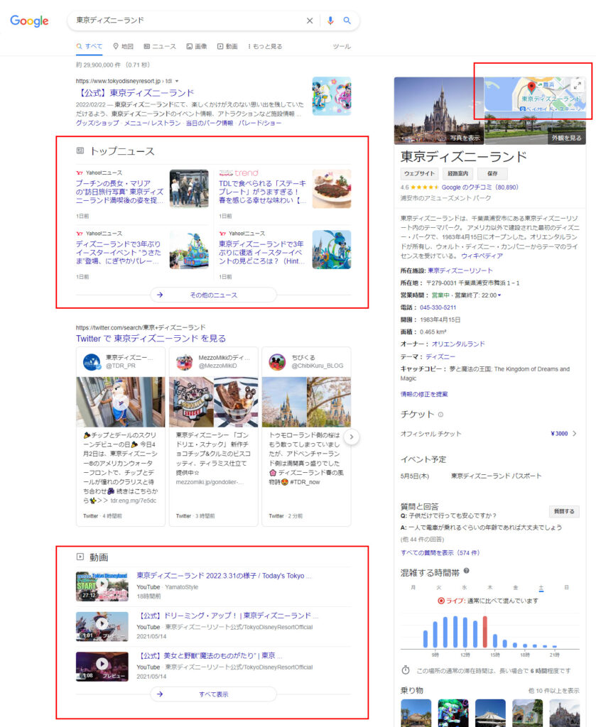 以下は、Google検索にて「東京ディズニーランド」と検索した際の結果です。
