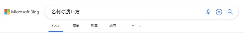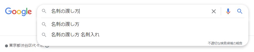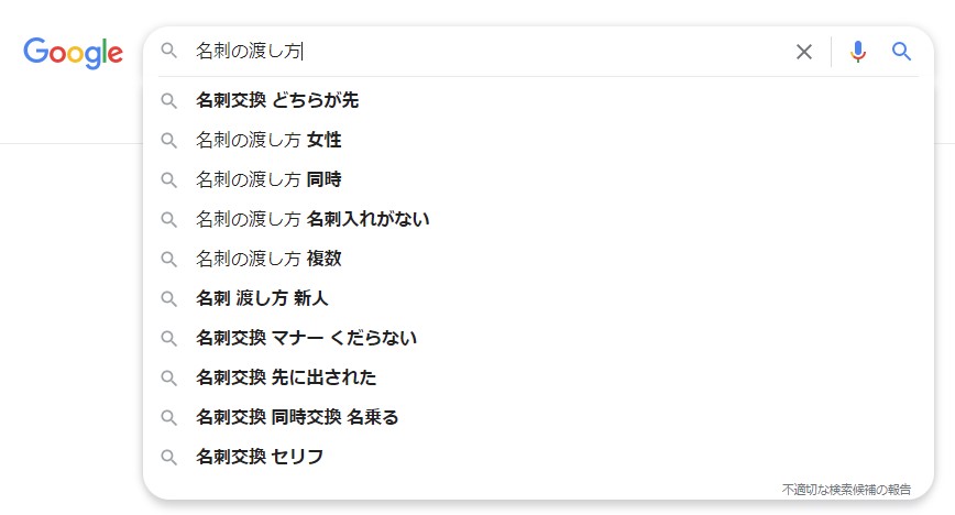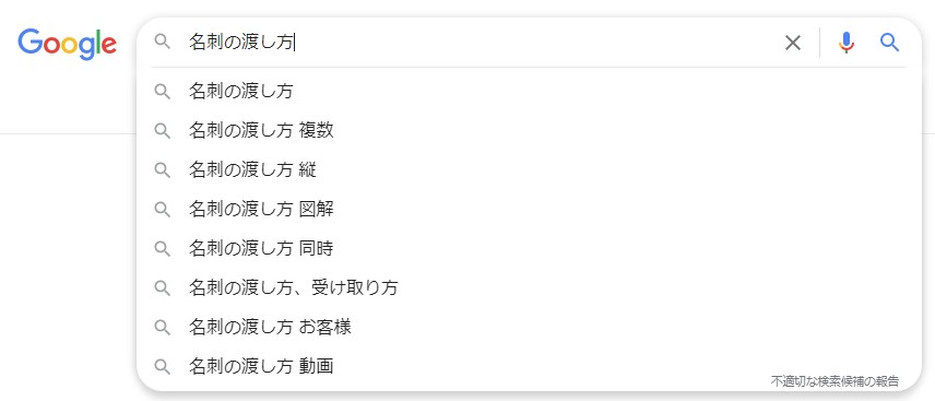 「名刺の渡し方」で検索した際に、その検索窓の下に表示されるメニューの部分です。