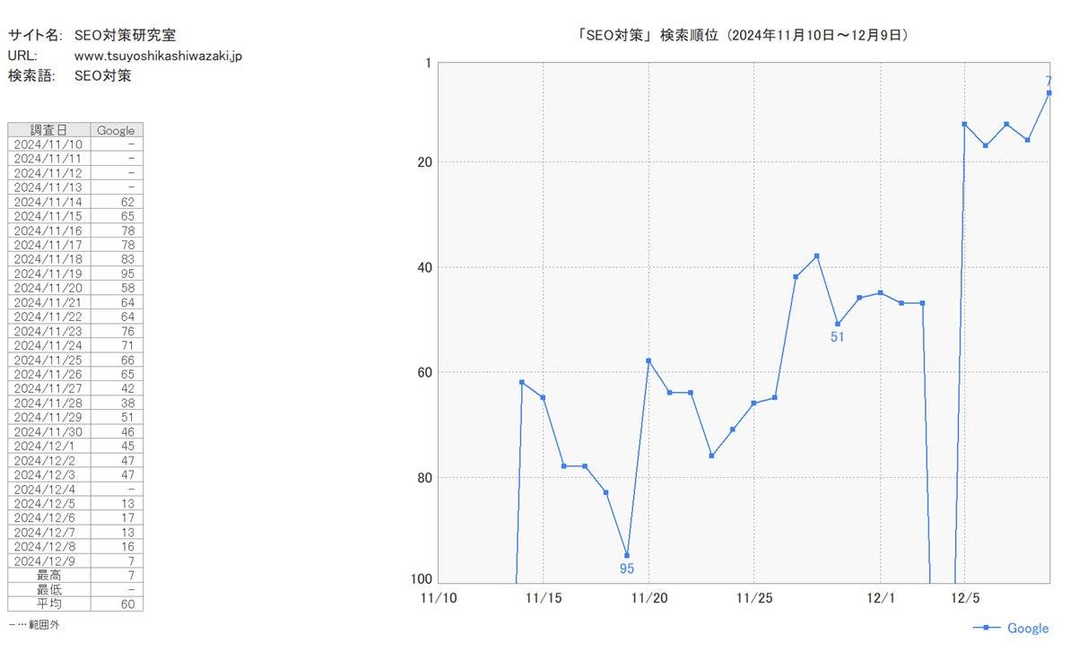 12月14日になって、先日まで半ばあきらめていた「SEO対策」というキーワードでの順位が、思いがけず元に戻ってきました。さらに、もう一つの重要キーワードである「SEO」も35位前後まで持ち直し、かなり好調な流れです。
