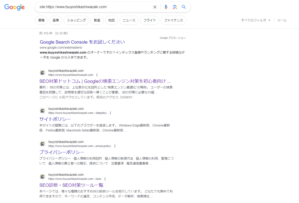 その他にもGoogleでインデクスされているかをみる、「site:ドメイン名」コマンドでも無料で確認することができます。