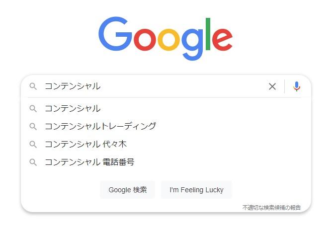 例えば、Googleで弊社の名称「コンテンシャル」と検索すると、画像のように「代々木」「電話番号」といったサジェストや、「株式会社デブリ」「柏崎 SEO」といった次の検索時に入力されるであろう再検索キーワードがいくつか表示されます。
