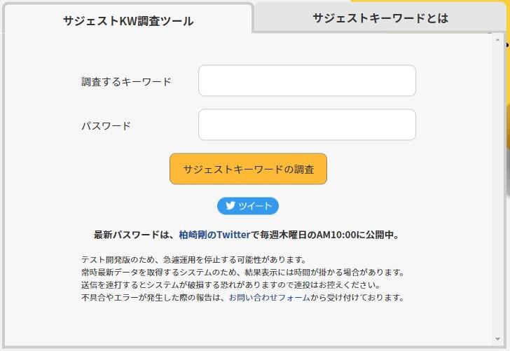 調査するキーワードと、柏崎剛のTwitterで公開されているパスワードを入力後に、「サジェストキーワード検索」ボタンを押すだけで、50音、A~Z、0~9順にソートされたサジェストキーワードの一覧が一括取得できるツールです。
