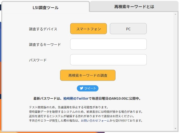 調査するデバイスを選択と調査するキーワード、柏崎剛のTwitterで公開されているパスワードを入力後に、「再検索キーワード調査」ボタンを押すだけで、再検索キーワードの一覧が一括取得できるツールです。