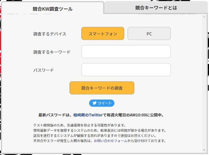 調査するデバイスを選択して、調査するキーワードと、柏崎剛のTwitterで公開されているパスワードを入力後に、「競合キーワード調査」ボタンを押すだけで、競合キーワードの一覧が一括取得できるツールです。