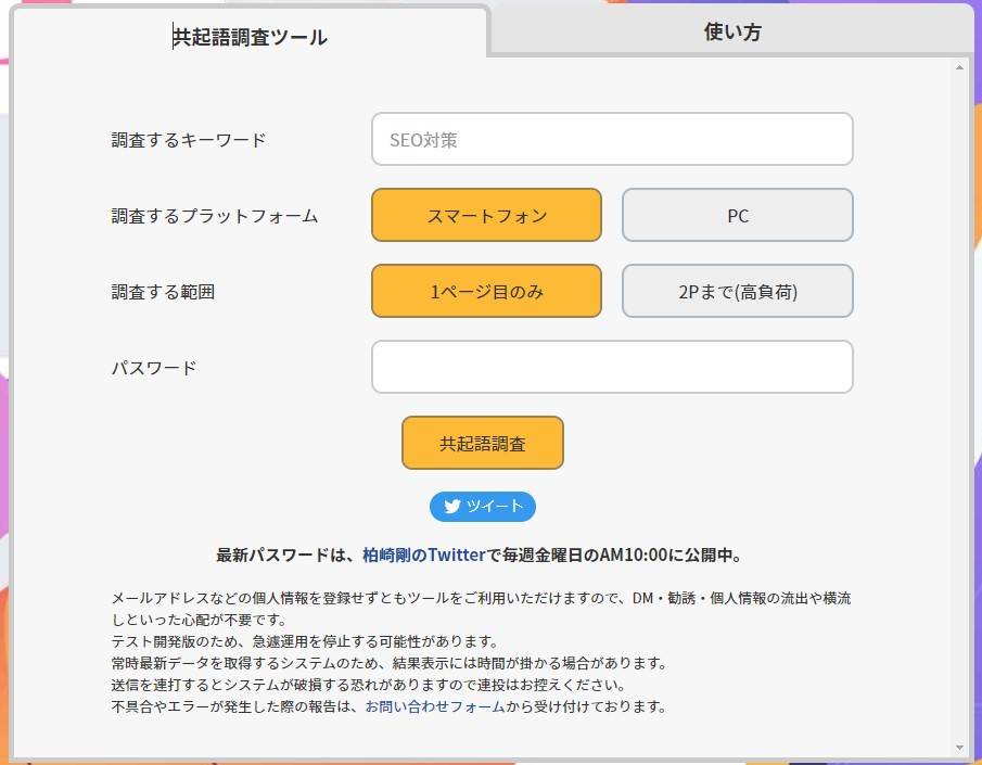 調査するキーワードを入力して、調査するプラットフォームと調査する範囲を選択して、柏崎剛のTwitterで公開されているパスワードを入力後に、「共起語検索」ボタンを押すだけで、共起語の一覧が一括取得できるツールです。