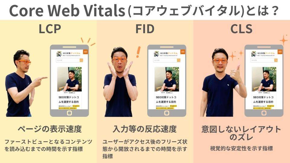 このCore Web Vitalsは、主にサイトスピードやユーザビリティに関する指標で、以下の3つで構成されています。