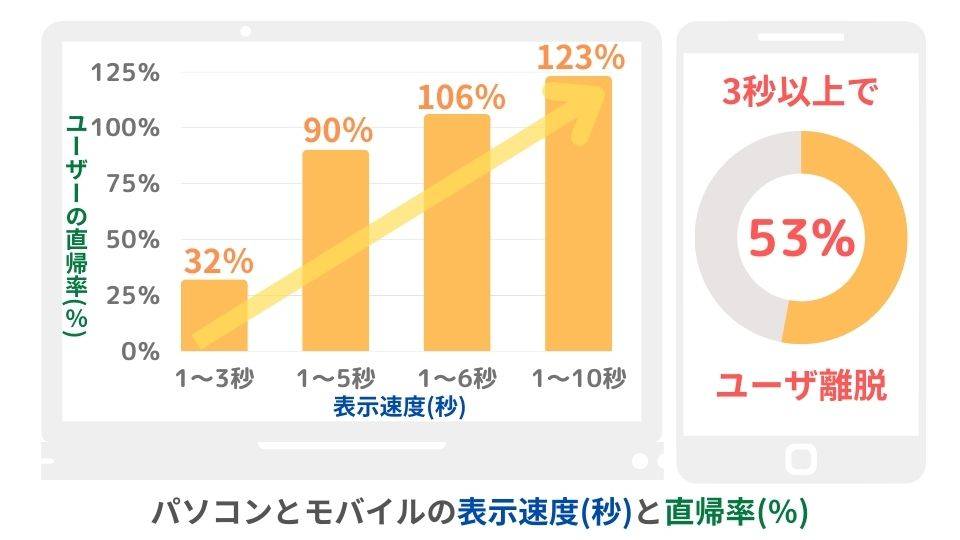 上記はパソコンにおいての検証データですが、モバイルページに至っては表示に3秒以上掛かっただけで、53%ものユーザーが離脱してしまいます。