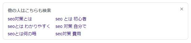 例えば「SEO対策」と検索し、特定のページをクリックした後にすぐにGoogleへ戻ると、以下のような「他の人はこちらも検索」というボックスが表示されます。