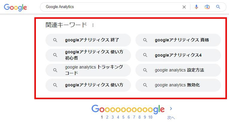 例えば、「Google Analytics」で検索すると、先ほどのサンプルのようになります。