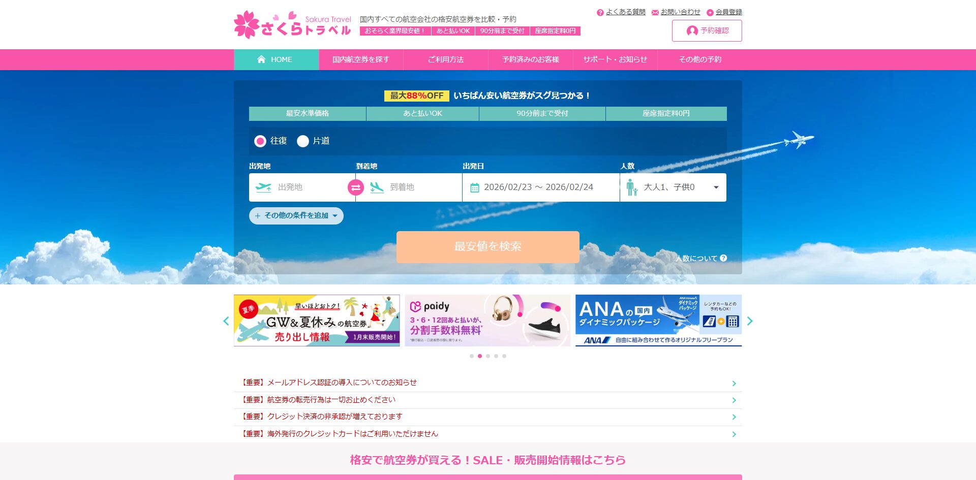 さくらトラベルは、国内すべての航空会社の格安航空券を比較・予約できるサービスです。構造的な設計やタグの正規化、外部評判の向上を中心に支援を行いました。